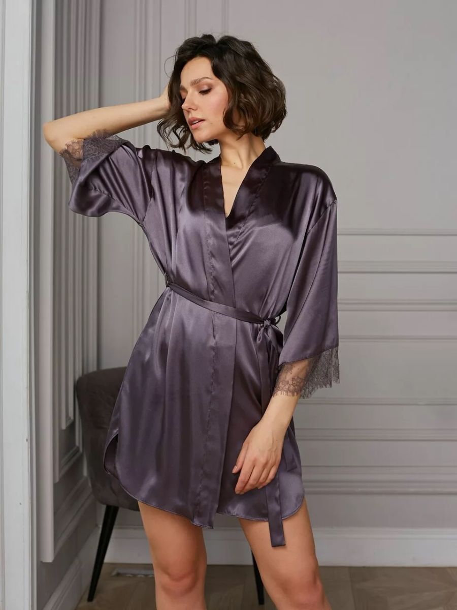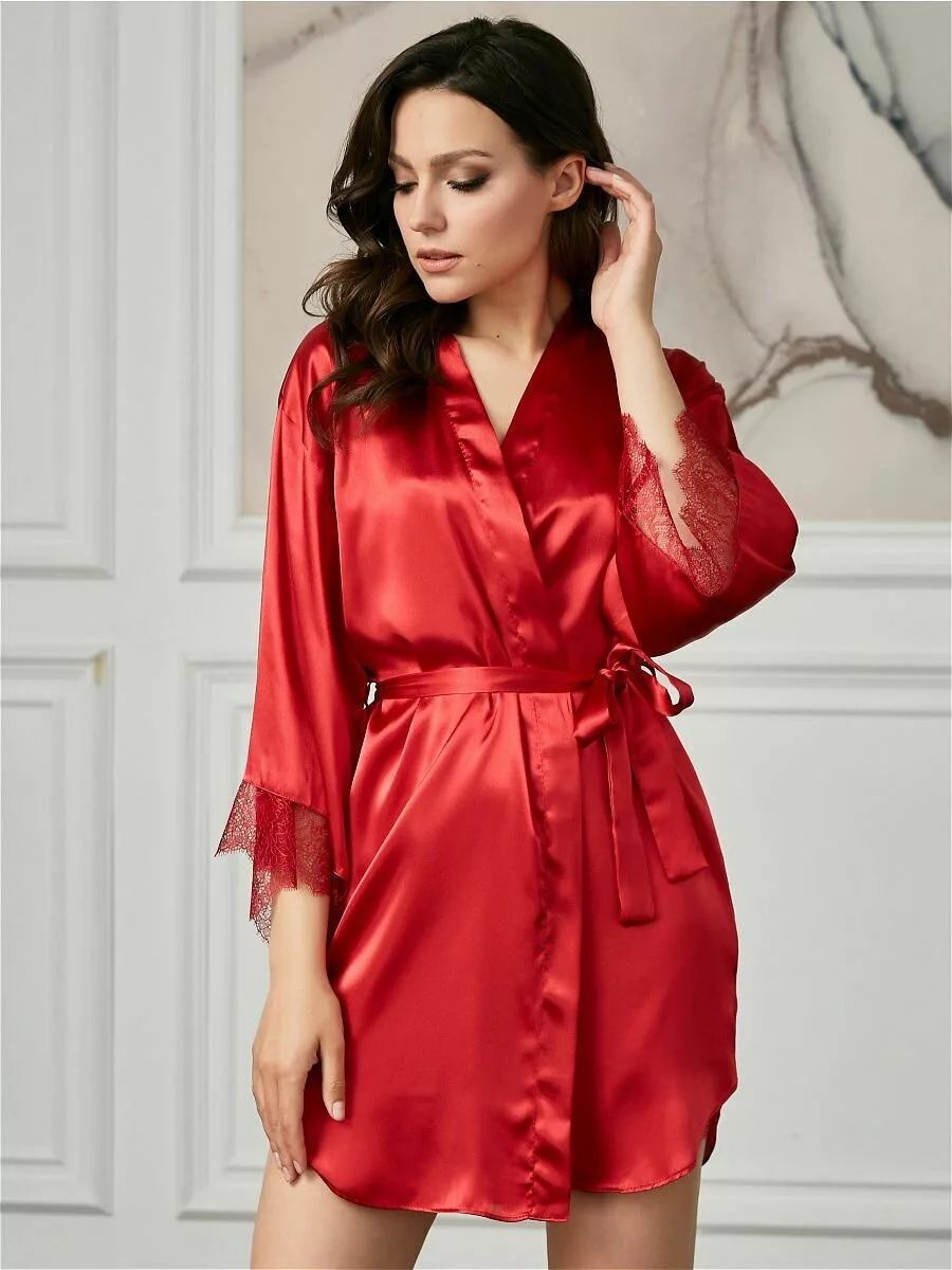Короткий халат на запах из искусственного шелка с поясом, декорированный кружевом по рукаву.