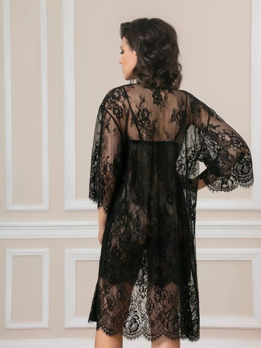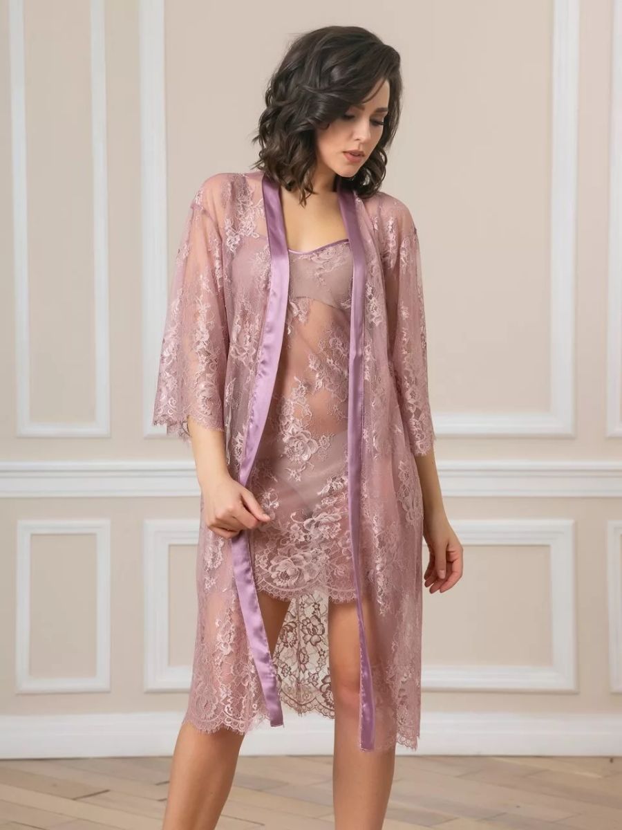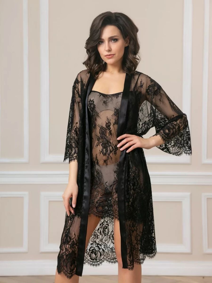 Короткий халат на запах из кружева с поясом, декорированный атласом по борту.
