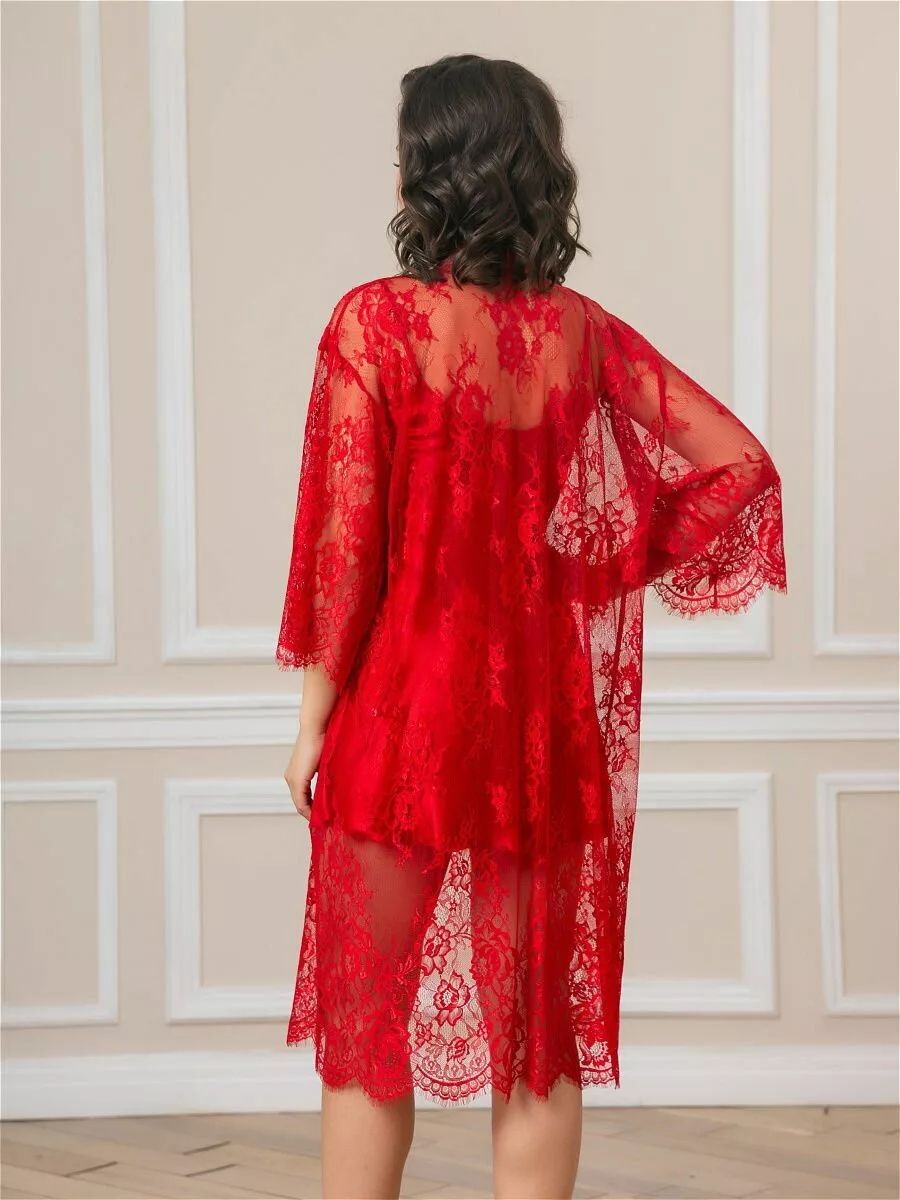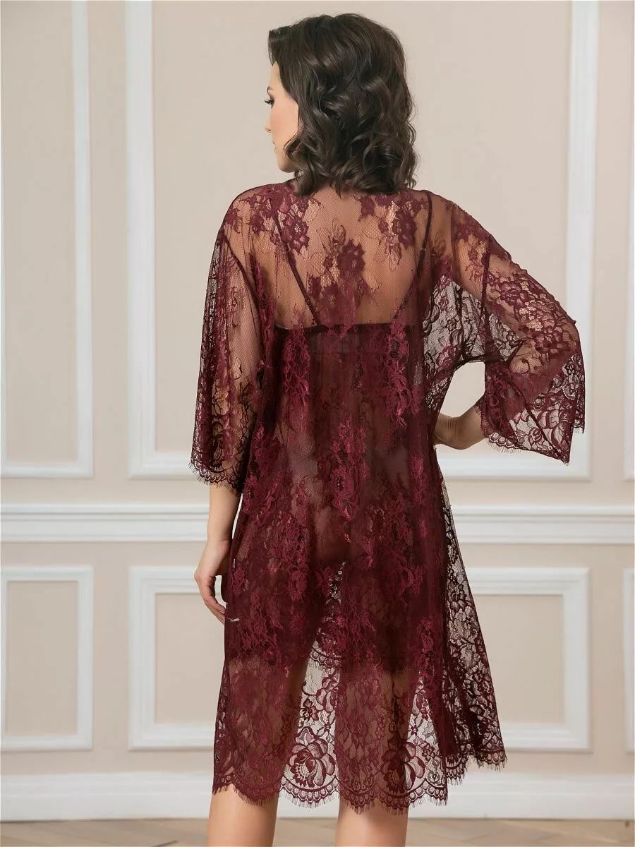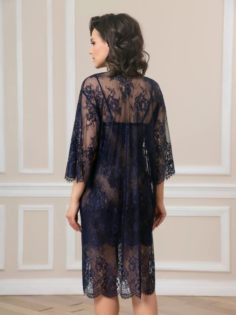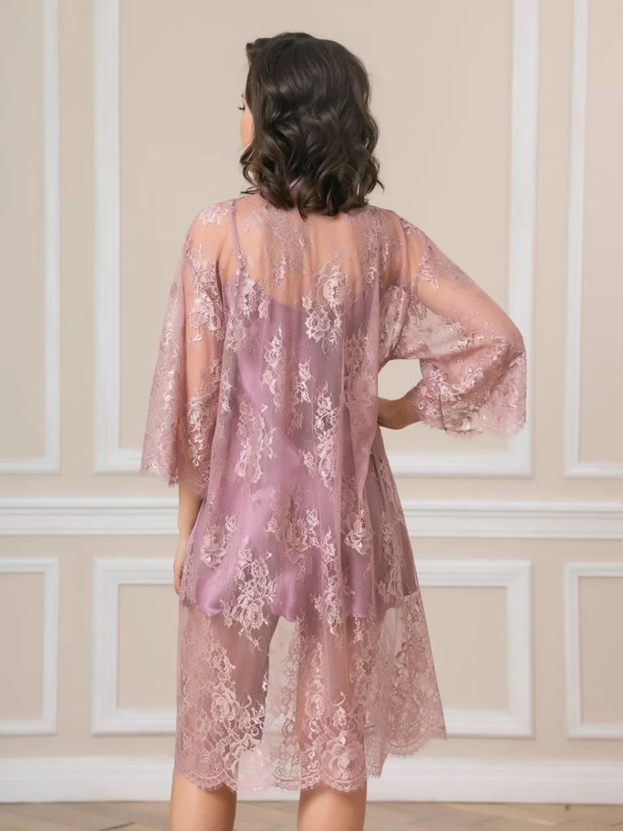 Короткий халат на запах из кружева с поясом, декорированный атласом по борту.