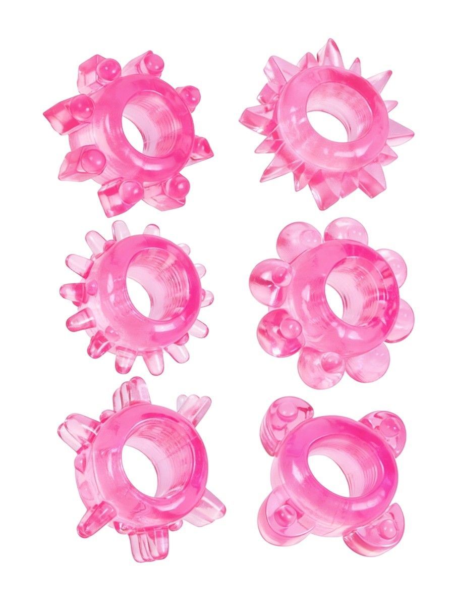 Эрекционное кольцо обеспечит продолжительную эрекцию и поможет продлить интимную близость. «Отростки» на внешней поверхности секс-игрушки будут стимулировать интимные зоны партнёрши. Эрекционное кольцо хорошо тянется. Изготовлено из приятного на ощупь материала. В наборе 6 колец с различным рельефом.