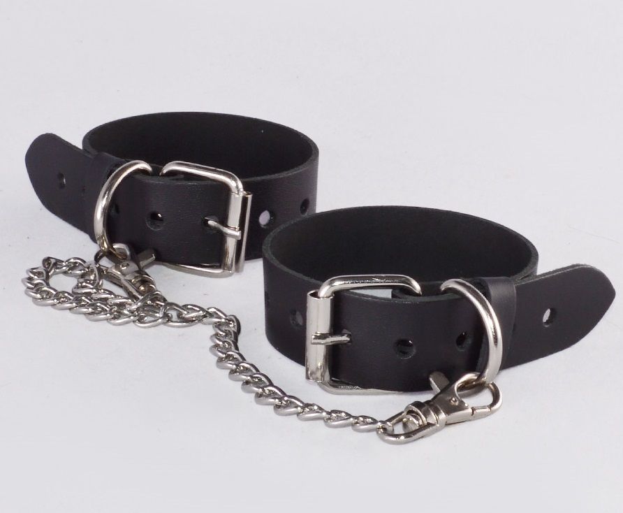 Оковы изготовлены из натуральной кожи. Регулируются пряжкой, имеют цепочку с карабинами.