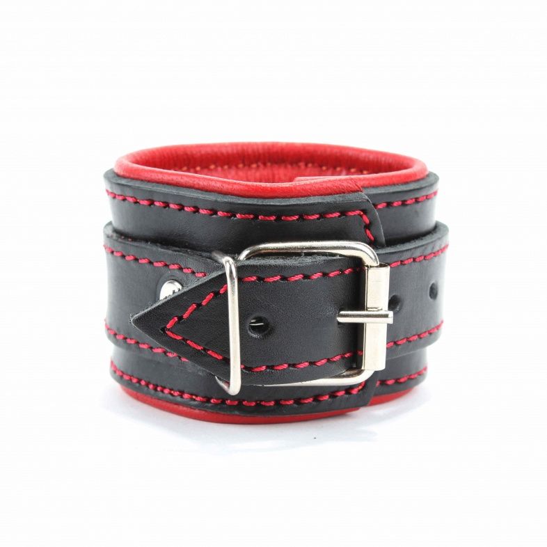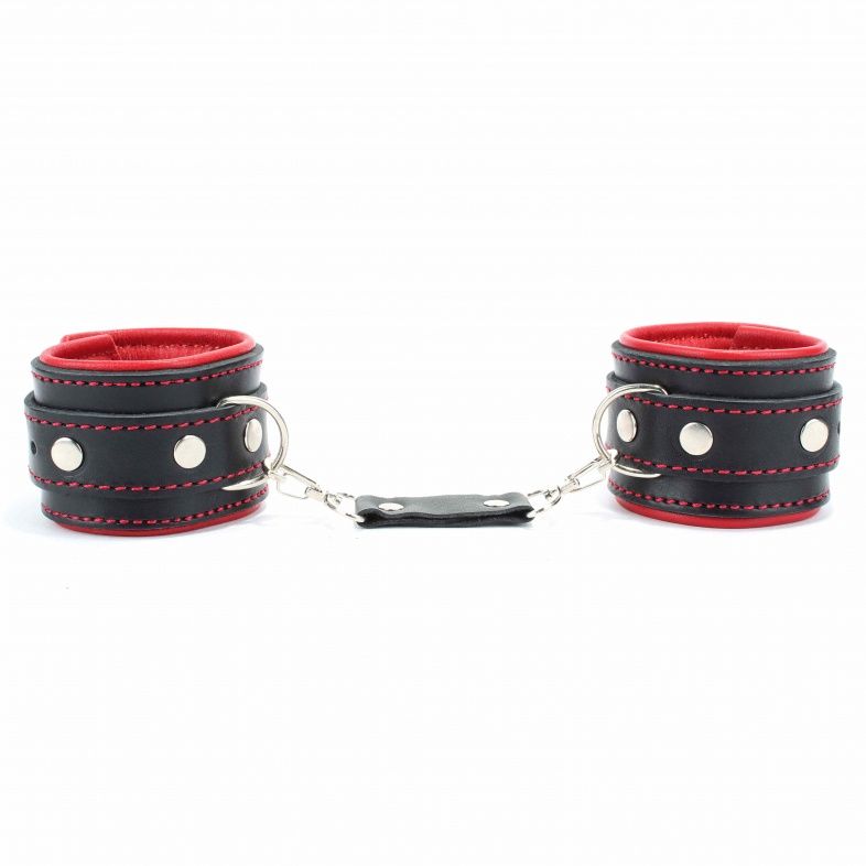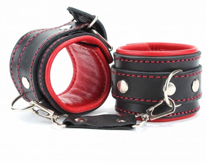 Оковы на ноги с красным подкладом. Выполнены из толстой ременной кожи черного цвета, подклад мягкая перчаточная кожа ярко красного цвета. На пряжке. Использована усиленная металлическая фурнитура. Строчка толстой ниткой контрастного красного цвета.