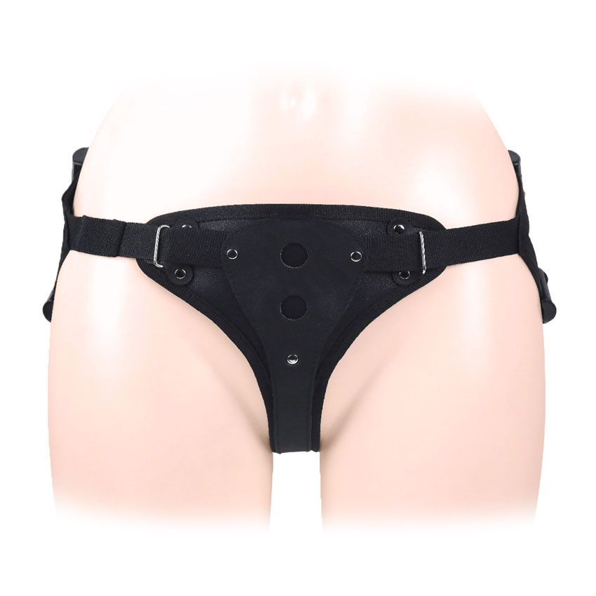 Женский пояс-трусики с 2 отверстиями для коннектора. Применяется в качестве страпона. К изделию прилагаются: коннектор и насадка в виде пениса с уплотнением в зоне головки. Интимный аксессуар имеет мягкую внутреннюю поверхность, предотвращающую натирание кожи. Благодаря наличию регулируемых ремней, пояс может использоваться людьми с различными параметрами. В комплекте: трусики, коннектор, насадка.