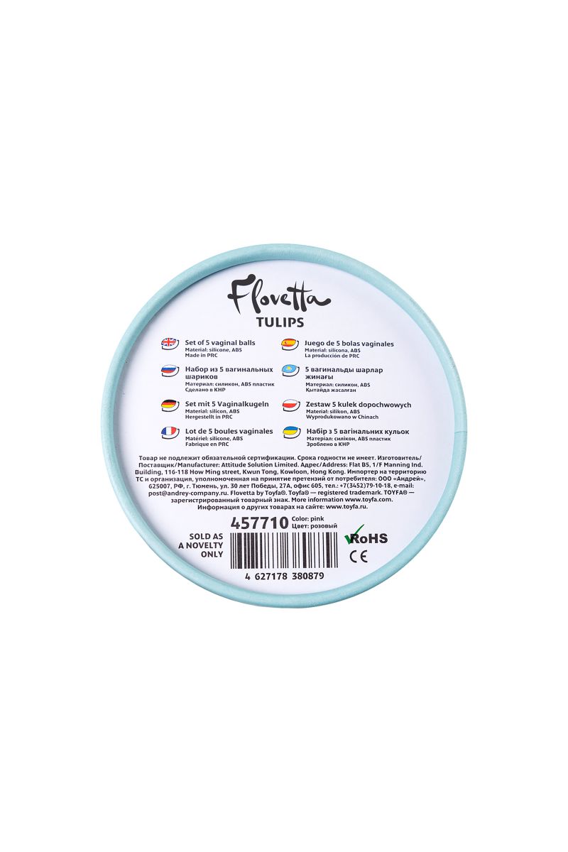 Набор из 5 вагинальных шариков Набор вагинальных шариков - настоящий must-have для всех представительниц прекрасного пола, вне зависимости от возраста и физиологических особенностей. Набор Tulips состоит из 5 двойных шариков, разного веса и диаметра. Длиный силиконовый хвостик поможет без проблем извлекать шарик после применения. На хвостике каждого шарика есть буквы от А до Е, где А - самый лёгкий шарик, а Е - самый тяжелый шарик. Начните тренировки интимных мышц с самого легкого шарика и увеличивайте постепенно вес, ориентируясь на свои ощущения. Шарик A: длина - 5 см, диаметр - 2,2-3,1 см., вес - 30 гр. Шарик B: длина - 5 см, диаметр - 2,2-3,5 см., вес - 40 гр. Шарик C: длина - 5 см, диаметр - 2,1-3,3 см., вес - 50 гр. Шарик D: длина - 5,3 см, диаметр - 1,9-2,7 см., вес - 60 гр. Шарик E: длина - 5,3 см, диаметр - 1,9-2,6 см., вес - 70 гр.